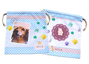 ワンちゃんの写真や家族の写真、イラストがポーチになります。オリジナルデザインの巾着袋を販売しています。