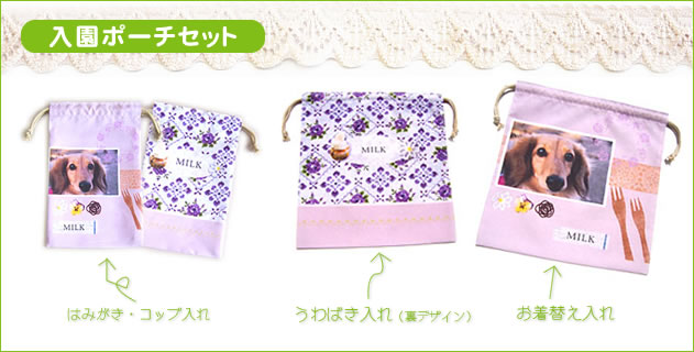 歯磨き・コップ入れ、お弁当入れ、お着替え入れにお子さんの写真と名前をプリントしてポーチにします。
